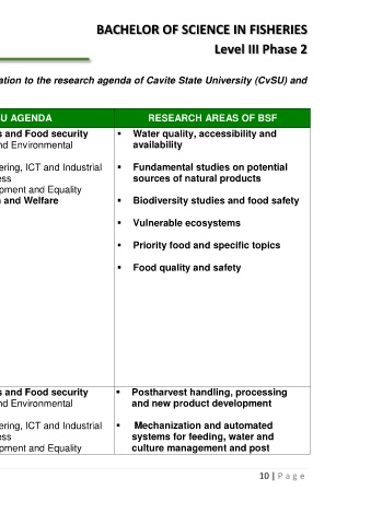 Table 3.1 The research areas of BS Fisheries (BSF) program in relation to the research agenda of Cavite State University (CvSU) and