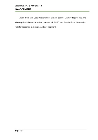 CAVITE STATE NIVERSITY NAIC CAMPUS Aside from the Local Government Unit of Bacoor Cavite (Figure 3.3), the following have been the active partners of FMSD and Cavite State University - Naic for research, extension, and development: 23 | P a g e
